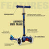This kid's scooter offers a smooth ride with 3 wheels, a wide deck for easy balancing, and shock-absorbing wheels for effortless cruising. It features full-contact rear brakes for quick stops and an exciting design with two large front LED PU wheels and a smaller rear LED wheel that light up while riding, dazzling both day and night. The anodized metal handlebar is adjustable to three heights (59 cm, 66 cm, and 73 cm), growing with your child for long-lasting fun. Its lean-to-steer technology and lightweight frame ensure better control and balance through natural movement, while ABEC-7 bearings provide a smooth, quiet glide. The low deck makes it easy for kids to hop on and off, and the reinforced aluminum rear brake offers safe, reliable stopping. No assembly is needed—it’s ready to ride right out of the box, and the detachable handlebar makes storage and transport simple with just a press of a button.